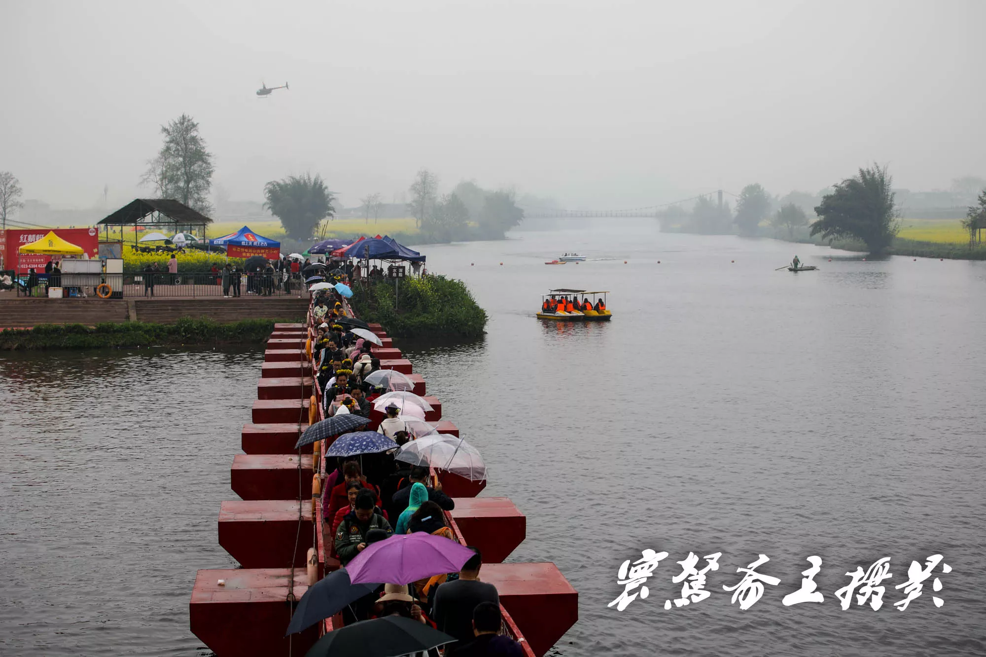 從山上下來,游客中心附近有些兒童的游樂設施,再往前就是浮橋碼頭,穿過浮橋就進入花海了,浮橋還是那座老橋,橋上來來往往的人還是挺多。