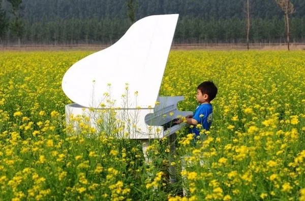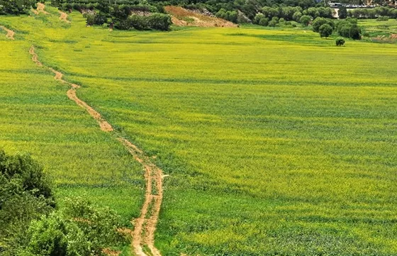 3、不同景別適合不同構圖技巧:如果讓大片的油菜花鋪滿畫面,整幅作品顯得沒有主體,僅僅是鋪滿了顏色,并不能算作一幅成功的作品。在色彩學里,黃色和綠色是比較接近的兩種顏色。因此,有這兩種顏色過渡的場景是我們拍攝的好題材。
