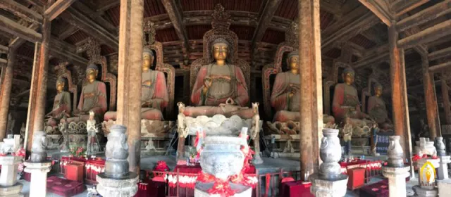 大雄殿是中國古代建筑中最大的單層木結構建筑,被譽為“中國第一大雄寶殿”。大雄殿筑于高3米的臺基之上,為五脊單檐廡殿式,面闊九間,長48.2米,進深五間,寬25.13米,高達21米,建筑面積1829平方米,是佛教頂級建筑,殿內主供七尊大佛為原汁原味的遼代塑像,由東至西依次為迦葉佛(貴人佛、成就佛)、拘留孫佛(平安佛)、尸棄佛(健康佛)、毗婆尸佛(興業騰達佛、智慧佛)、毗舍浮佛(招運佛、發財佛)、拘那含牟尼佛(光明佛)、釋迦牟尼佛(佛教創始人),七佛皆端坐于須彌座上,通高9米以上。尤以正中的毗婆尸佛最高,合座高達9.5米。因“過去七佛”并列一堂,佛祖釋迦牟尼偏居其中,為佛教界獨一無二。另外,每 尊佛前左右各有一脅侍菩薩相對而立,高2.5米,共14尊。諸菩薩或仰或俯,或斜立或平視,兩足踏蓮花一朵。寶相莊嚴,栩栩如生。