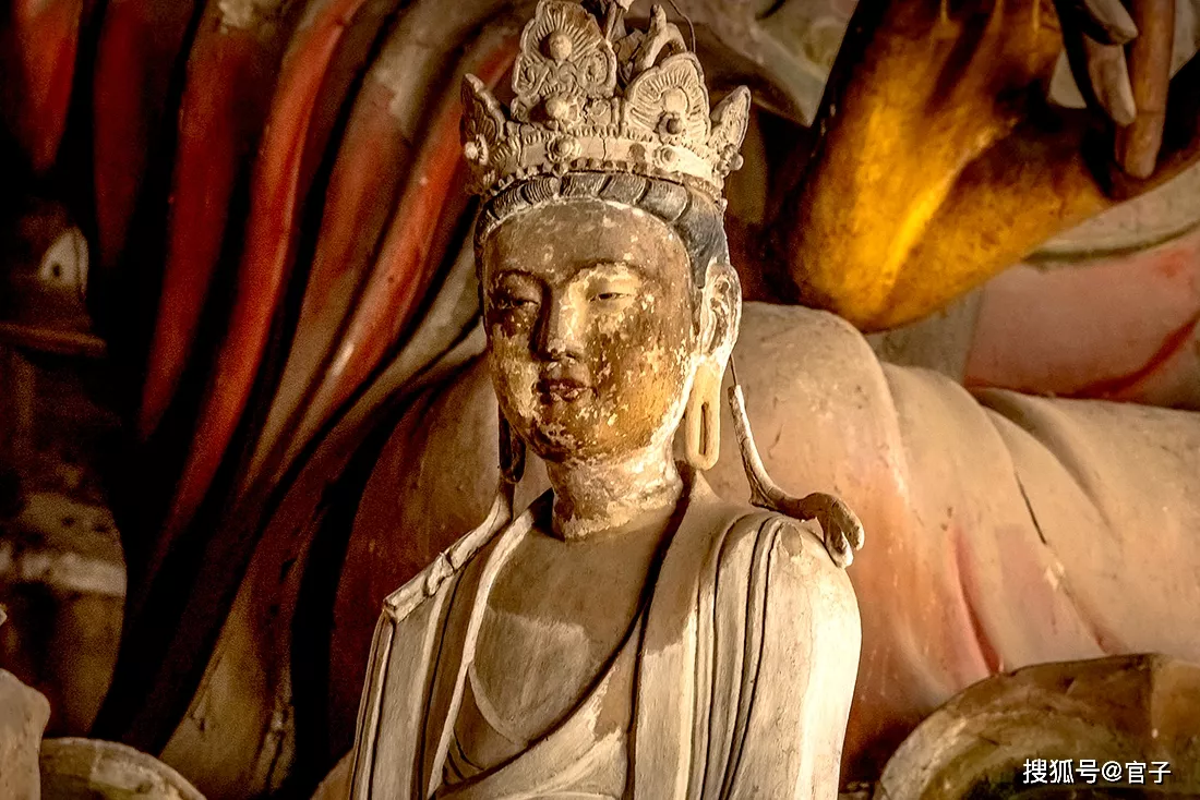 七佛的背后是倒坐觀音,由章子怡主演的《一代宗師》電影就在這里取過景,這是一尊男相觀音,十分少見。我在央視電視《國家寶藏》中看介紹,在觀音兩側除了善財和龍女還有一鷹與一凈瓶,又稱“鷹瓶觀音”,這種圖像模式的觀音并不多見。不過,這次我真的仔細找了很久,不知這只鷹什么時候飛走了?
