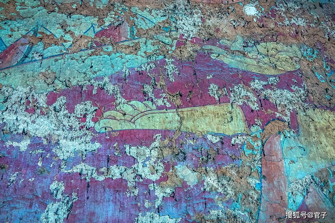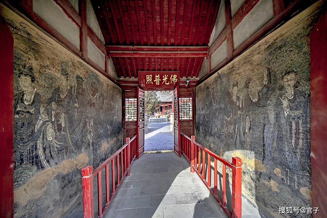 殿內的三面墻上都繪有壁畫,東西兩側為元代作品,正面墻上原畫十八羅漢,是明代時期的作品,上世紀80年代修繕時被揭取下來,現保存在大殿后面。元代壁畫破損嚴重,這就是歲月撫摸的痕跡。