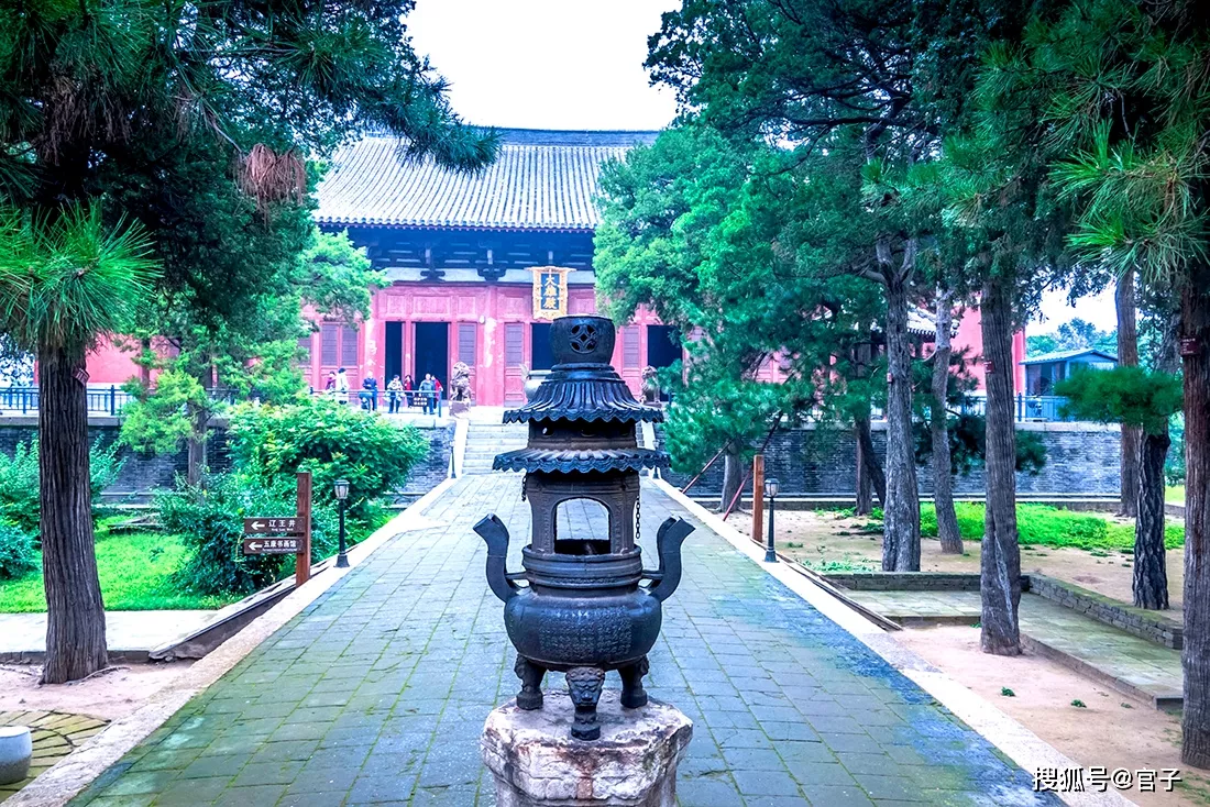 步入景區,進入視野的是層次錯落的古建筑,前面的山門、牌坊、天王殿均為明清建筑風格,最高大的那棟古建筑與前面的建筑風格明顯不一樣,尤其是巨大的飛檐斗拱,頗有《詩經·小雅·斯干》中“如鳥斯革,如翚斯飛”的風采,氣宇軒昂,一下子就吸足了眼球。