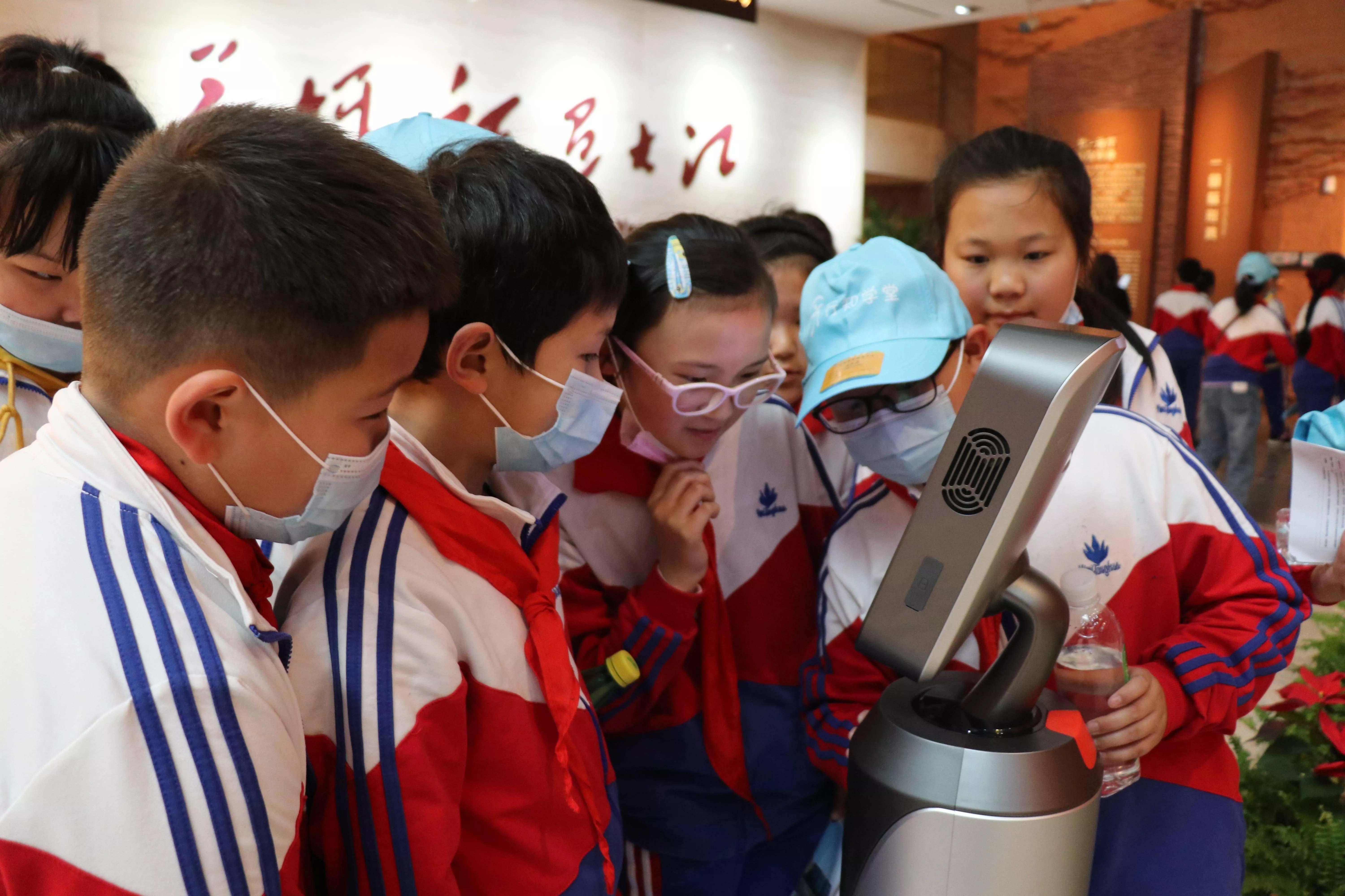 3月30日上午,合肥市某小學學生在渡江戰役紀念館開展黨史學習教育,圍觀“導覽機器人”