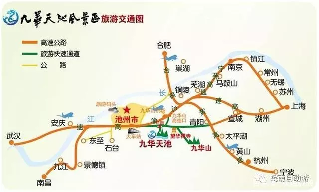 在池州汽車總站(汽車站、火車站、公交車站三站合一)搭乘池青九公交專線(池州車站到青陽九華山方向專線公交車)在318國道馬衙橋站牌下,往里步行800米即到,或乘出租車直接到九華天池景區游客中心下。