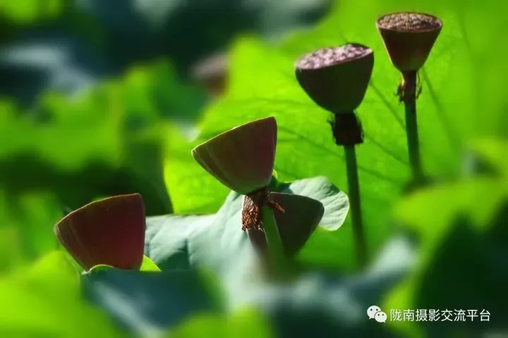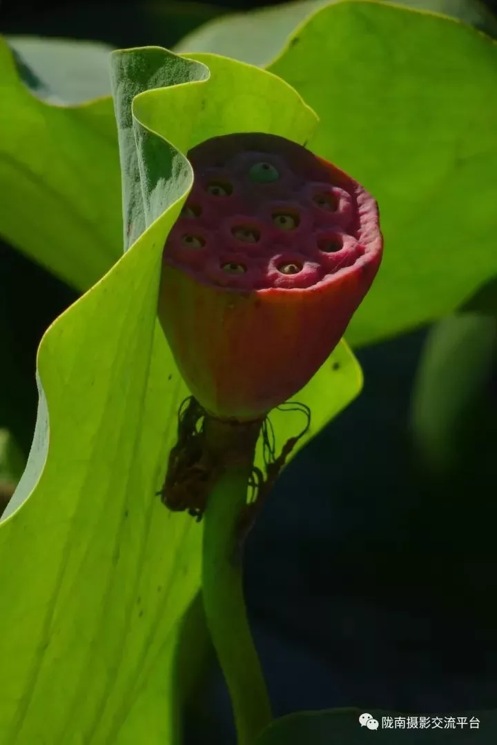看那邊朵朵通紅的蓮蓬像受閱的衛士,昂首挺立,整齊的排成一列,上面的鏈子粒粒可數;