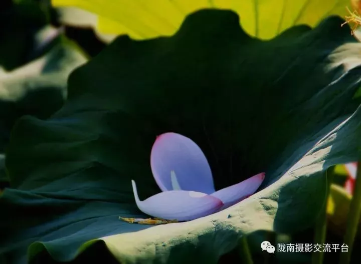 再看那邊一柄闊葉中心有幾個粉白嬌嫩的新鮮花瓣,像是剛剛零落的,好似一個新誕的嬰兒熟睡在襁褓中,荷葉就像一位慈母在精心呵護著它,也許只是想挽留住她即將逝去的青春吧!