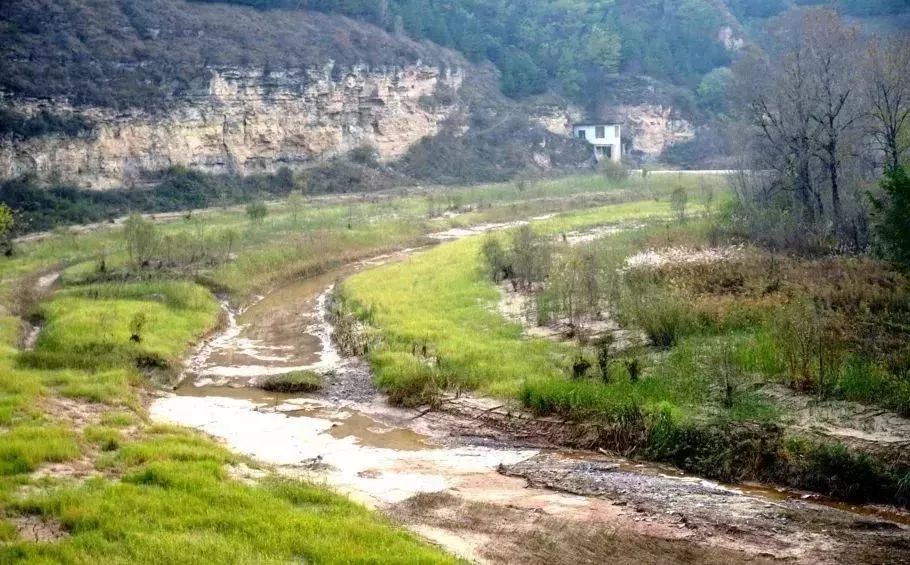 一條叫蒲水的河流,從村東蜿蜒而來,拐過五道彎緩緩穿村而過,形成一個巨大的s形,切割著河流兩岸的山地。s形河流兩側,是樹木蔥郁的村莊最高山崖頭山,與東面黃家山隔河相望,形似半島,恰好構成太極圖的陰陽魚圖。窯洞、瓦房、麥苗、松林、藍天,山的奇駿,水的靈秀,渾厚的黃土殘垣,勾勒出一幅隴上黃土風情畫卷。