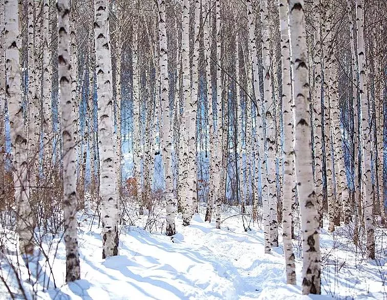 在寒冷的冬天,由于在雪中而更加耀眼的白樺樹林