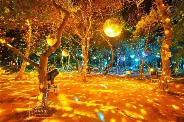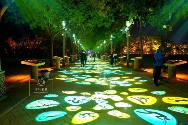 從華貿國際酒店步行至這里需要20分鐘,建議騎自行車前往。還沒進入景區,就先被門口的燈光所吸引:樹上掛滿了星星月亮等不同顏色的燈飾,門前的路被投影燈照射的星光點點。