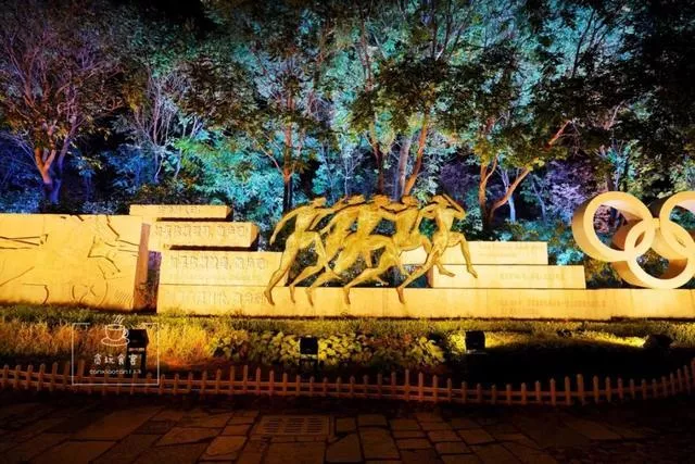 晚上時公園只開放北門,從北門進入可以看到一池噴泉水,沿著水邊行走在公園內,這有很多與奧運相關的雕像,其中最壯觀的應該是奧林匹克浮雕墻,浮雕全長312.61米,均高2.7米,采用珍珠黑花崗巖石材雕刻成的,奧林匹克浮雕墻,該墻無論展示規模、形式以及內容為世界僅有。