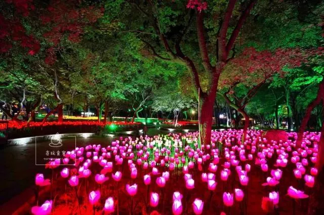 沿著路一直往前走,怪樓奇園別有洞天,這里與白天完全不一樣,到處都是造型變換的燈光;比如蝶舞花海、迷幻燈陣等等。