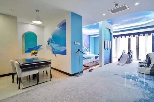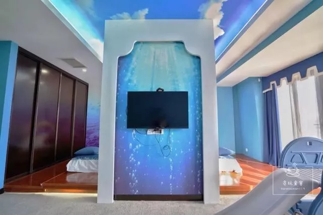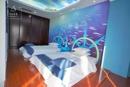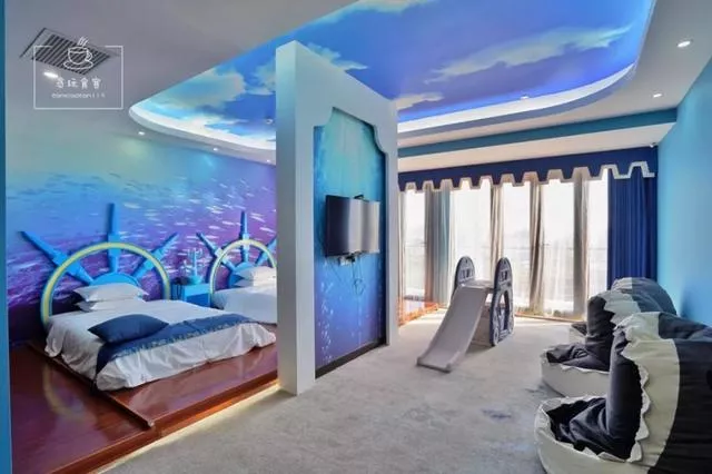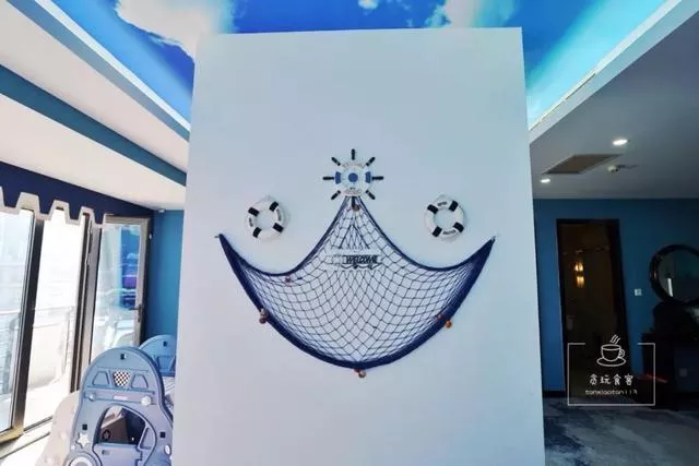 整個房間,最有特色的當屬臥室。既然是海洋主題房,自然少不了碧海藍天及海洋生物。雙床房臥室主要以榻榻米形式為主,背影墻上彩繪著魚群圖案,床頭是船舵設計,抬頭可見蔚藍色的“天空”,眼前則是海船造型的擺件,總之躺在床上就會有海洋探險的代入感。