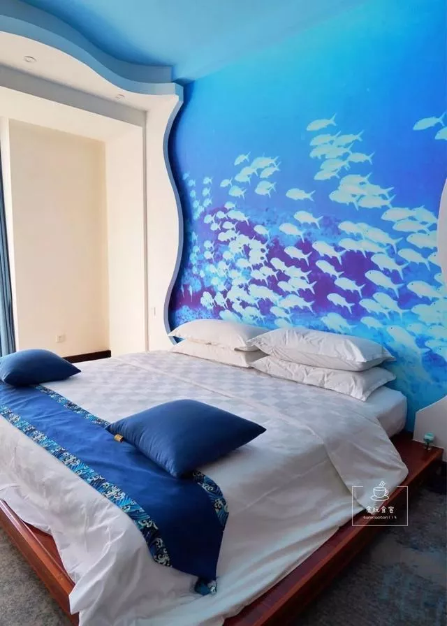 另外一件臥室也是海洋主題,只不過這是一間大床房,床頭上依然可見魚群圖案。
