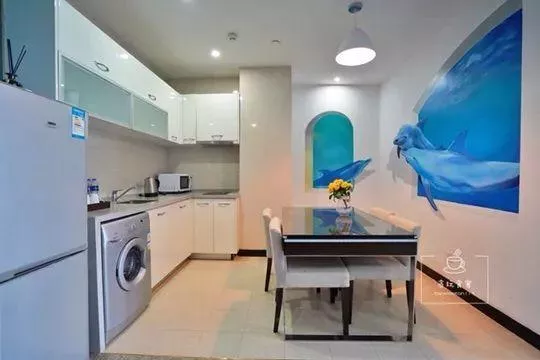 一進門左手邊是廚房,灶臺上擺放著飲品小吃,還有電水壺、微波爐等小家電,旁邊是冰箱和洗衣機。廚房的墻角上畫著三只海豚的3D圖案,仿佛要破墻而出,與我們共享大餐。