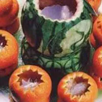 制法:將西瓜的上端切下一塊作蓋子,挖出瓜瓤,不要挖太多,影響瓜皮的完整。挖好后,將整個瓜殼用開水泡一泡,用潔凈布揩干。