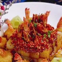 3.鍋內加花生油,燒至6成熱時,下入寶塔蝦,炸成金黃色撈出,擺在青筍周圍。