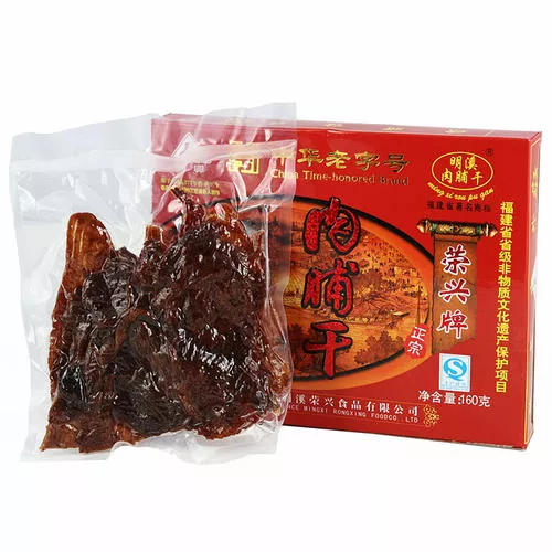 明溪肉脯干 明溪肉脯干是客家風味食品,歷史悠久,載譽五百余年, 居“閩西八大干”之首,馳名海內外。系精選鮮豬后腿瘦肉,以傳統工藝,上乘調味品,通過削片、腌漬、炭火精心烘烤而成。本品風味獨特、營養豐富,產品具有不干不燥、松香錦甜、原汁原味、熏香、醬香、麻辣、回味悠長等特點。明溪肉脯干是用精瘦牛肉浸腌于面制的醬油中,加以丁香、茴香、桂皮、糖等配料,經1周左右,再掛歷在通風處晾干,然后放入烤房熏,明溪肉脯干,明溪肉脯干簡介,明溪特產
