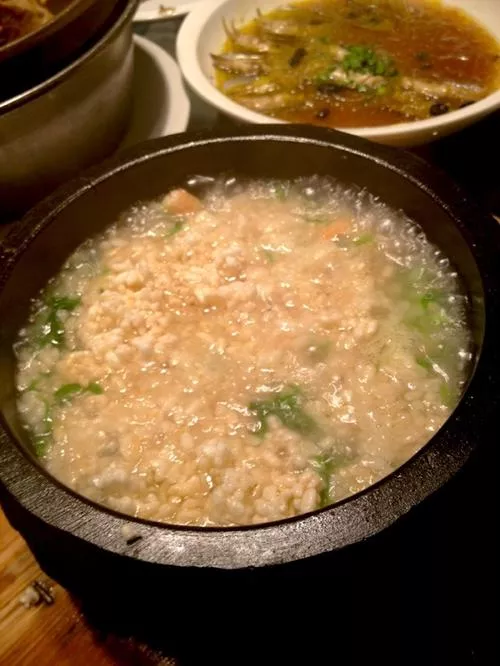 石鍋菜泡飯 這種石鍋呈圓柱形,直徑在15厘米左右,下面墊木板,使用時把石鍋燒熱,倒入菜品,堂做即可。就此菜來說,菜泡飯是嘉興人常吃的一種飯,即用剁碎的青菜加米飯燒制而成,上桌時用小碗盛裝,因為過于傳統很少能引起食客的注意。運用這種石鍋后做成半湯菜,徹底改變菜泡飯的傳統印象,一般先在廚房將石鍋燒熱,倒進燒好的菜泡飯,上桌。然后在食客面前服務員將熱雞湯倒進石鍋,蒸汽和香味一起布滿全桌,氣氛很好。【詳細】