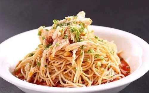雞絲涼面 雞絲涼面是四川成都著名的傳統小吃,歷史悠久,廣泛流傳于成都等四川等地,在四川全省有很大影響,被成都市政府評為“成都市名小吃”。其特點是多味調合,清爽利口,面條有筋力,為夏季佳品。傳統雞絲涼面的做法很簡單,將機制的面條入沸水中煮熟,煮時不能煮得太軟,撈出放案板上趁熱灑熟菜油少許,抖散快速降溫,到互不粘連且已冷卻為止,成為涼面。然后放在大盤子上,加色拉油和麻油拌勻,盤底放入開水燙熟的綠豆芽。再將雞絲鋪放在面條上(雞胸肉煮熟,放冷后切絲),加上芝麻醬等各種調味料調勻,澆到面上再撒下蔥花和碎花生米即可。中文名:雞絲涼面外文名:cold noodles with chicken slices主要食材:堿水面,雞腿,黃瓜分類:四川小吃,四川的傳統小吃,口味:酸辣制作難度:簡單