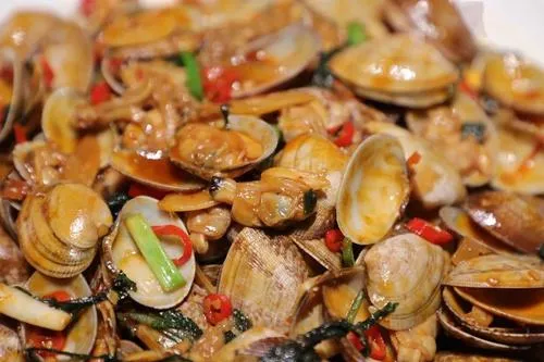辣炒蛤蜊 辣炒蛤蜊是青島最有群眾基礎的的海鮮菜,“吃蛤蜊、哈啤酒”是島城民俗。蛤蜊肉質鮮美無比,被稱為“天下第一鮮”、“百味之冠”。此菜采用本地市場銷售的全國口感最好、皮薄肉鮮的花皮蛤蜊為主要食材,配以辣椒爆炒,既有海鮮的美味 ,又有辣椒的香辣。辣炒蛤蜊是青島人的摯愛,新鮮蛤蜊肥嫩多汁,適于下酒。【詳細】中文名:辣炒蛤蜊分類:魯菜口味:香辣可口主要食材:蛤蜊,辣椒,蔥末,姜末等等