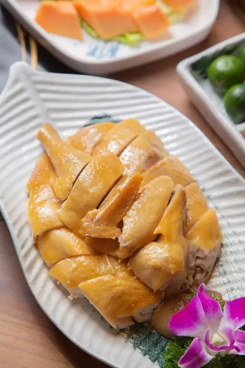 海南白切文昌雞是海南省文昌市地區最負盛名的特色傳統名菜,屬于海南菜,與加積鴨、東山羊、和樂蟹并稱為“海南四大名菜”,更是位居海南四大名菜之首,在海南有無雞不成宴的說法。海南文昌雞具有皮薄嫩滑、肉味馥香的特點,其烹調方法有很多種,其中以白切文昌雞最為出名,最能保持文昌雞原味特點,其做法看似間單,但做法講究。白切雞的調料非常具有海南特色,主要有生姜、蒜泥、香菜、精鹽,雞湯以及桔子汁組成,橘子汁選用海南本土生長的小橘子,汁酸甜可口,融和了蒜頭,香菜,蒜泥等。成菜特點是表皮酥薄,肥而不膩,讓人垂涎欲滴。白切文昌雞