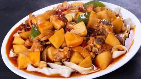 新疆大盤雞 新疆大盤雞又名沙灣大盤雞、辣子炒雞,是20世紀80年代起源于新疆公路邊飯館的江湖菜,主要用雞塊和土豆塊炒燉而成,還同新疆特色的馕、皮帶面搭配食用,其特點是:爽滑麻辣的雞肉和軟糯甜潤的土豆,辣中有香、粗中帶細,成為新疆最具代表的特色名菜。新疆大盤雞入選由中國烹飪協會主辦的“世界發布‘中國菜’活動暨全國省籍地域經典名菜”中新疆榜名單,被評為“中國菜”新疆十大經典名菜,還在第七屆烏魯木齊國際食品餐飲博覽會上被評為“新疆十大名菜”。【詳細】中文名:新疆大盤雞外文名:The Xinjiang market chicken分類:新疆菜,西北菜口味:鮮、辣、麻主要食材:雞肉,土豆,辣椒,洋蔥,四川粉皮,皮帶面起源地:沙灣縣