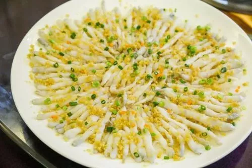 蒜蓉蒸沙蟲 蒜蓉蒸沙蟲是著名的湛江菜之一,屬于粵菜系,是湛江特色海鮮菜肴,此菜選用湛江海產品沙蟲制作而成,在湛江各沿海村莊,成群結隊的婦女在退潮后的灘涂采挖沙蟲,這種沙蟲有滋陰補腎養液之功效,市民喜歡用它煲湯、煮粥,口感清甜。蒜蒸沙蟲是最常見的廣東吃法,此菜鮮美、新鮮、甘甜、濃郁。由于它外觀難看很多外地人都不敢下筷,但吃起來肉厚油肥鮮嫩,且有嚼頭,愈嚼愈鮮,百食不厭。