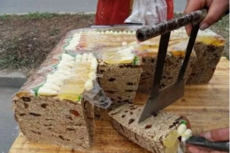 凌源切糕 凌源切糕,又稱粘糕、年糕,與喀左碗砣、凌源豆腐腦并稱為“朝陽三宗寶”,是朝陽凌源地方特色小吃。凌源切糕工藝制作具有遼西鮮明特色,選用上等的江米、豌豆、大棗為原料,先將粘米用清水淘洗三次,除去雜質。晾曬適度后加工成細面,臨蒸時掌握好米面的干濕度,拌成小顆粒狀備用。鍋中放蒸簾,最底層撒紅棗,用手把面撒均勻,鍋下火燒適度,一邊撒一邊燒火,面撒完后,上面撒一層蕓豆,最后再撒一層面,鍋加蓋子蒸5至10分鐘即可。