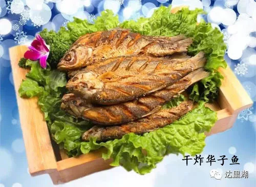 干炸華子魚 干炸華子魚是一道選用達里諾爾湖盛產的華子魚為原料,經過干炸而成的特色佳肴,誘人的金黃色澤,外酥里嫩的口感,留給人難以忘懷的鮮美味道。達里諾爾湖享有我國第三大天鵝湖的美譽,獨特的高原氣候、特殊的半咸蘇打水質、純天然無污染的自然環境,使得達里諾爾湖盛產的瓦氏雅羅魚(俗稱華子魚)營養豐富,肉質細膩。