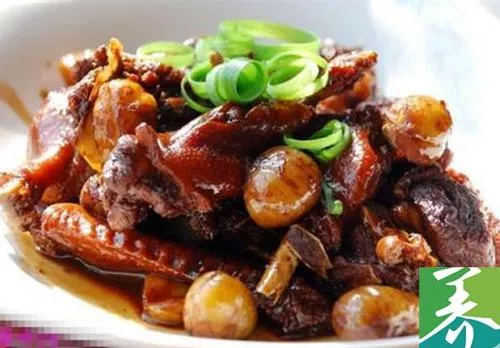 紅燒板栗鴨 紅燒板栗鴨是貴州銅仁的傳統名菜,屬于黔菜系,以銅仁土產板栗和仔鴨加佐料烹飪而成,其色澤紅褐,咸甜并有細嫩糯酥,有較高的營養價值。紅燒板栗鴨在銅仁也很有名,也很容易在當地的土菜館找到這道菜,這道菜也是香味濃郁,不過季節性比較強,多在每年重陽前后食之。板栗配上鴨肉,色相極佳,吃起來的時候咸甜適中,掌握的恰到好處。